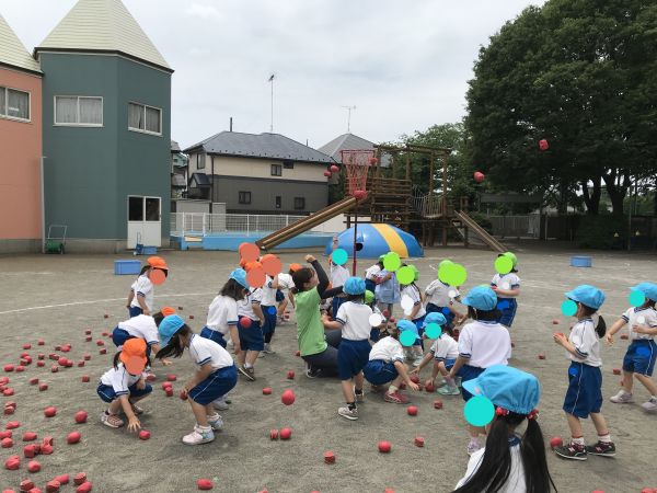 この日は学年の体操の時間に加え、年中長組では『みんなで遊ぼう』に向けて、年中組は玉入れの練習、年長組は綱引きの練習を本番を想定し、先生たちを相手に模擬対決!!