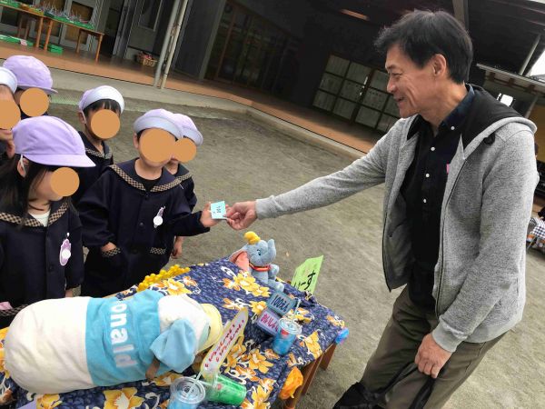 学年ごと、園長先生のお部屋や職員室、年長さんのお部屋など、お買い物に使うお金を配りながら、手作りの商品たちをセールス!