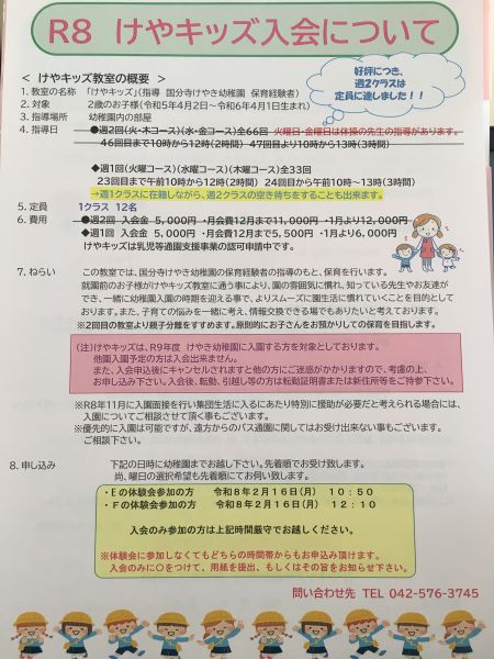 歳児教室けやキッズ、2回目の体験説明会及び入会の詳細が決定しましたのでお知らせ致します。